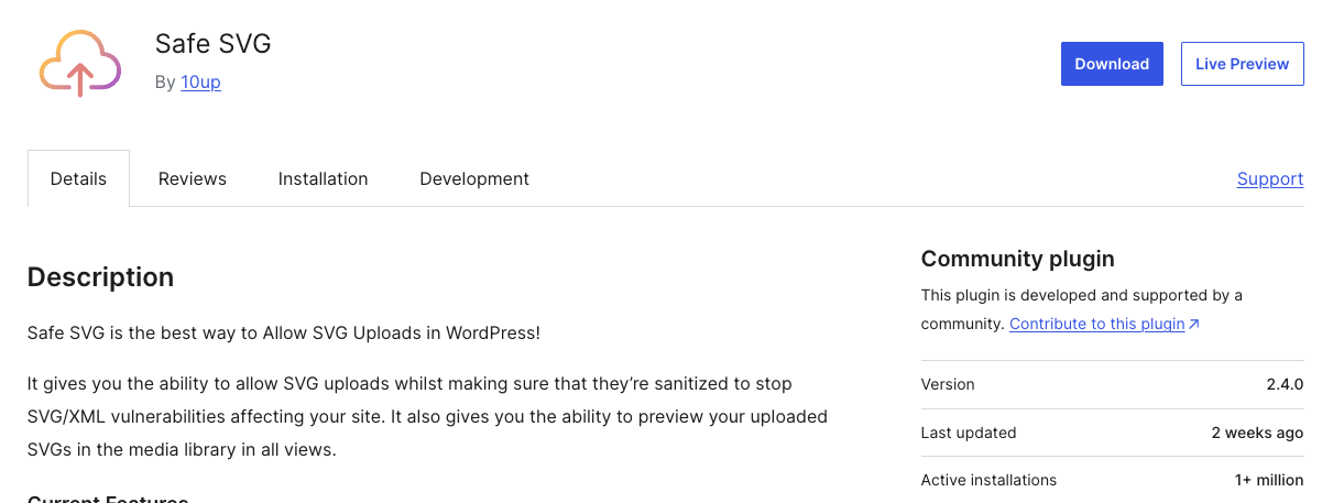 Safe SVG is a trusted WordPress plugin that allows safe uploading and use of SVG files by sanitizing them to remove any harmful content. More than a million websites already rely on this plugin, which shows how dependable it is. If your website uses SVGs, this plugin is a must-have. It makes it possible for WordPress (and thus Divi) to accept SVGs just like other image formats without risking site security.